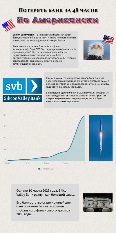 Однако 10 марта 2023 года, Silicon Valley Bank рухнул как большой шкаф. Его банкротство стало крупнейшим банкротством банка со времен глобального финансового кризиса 2008 года.