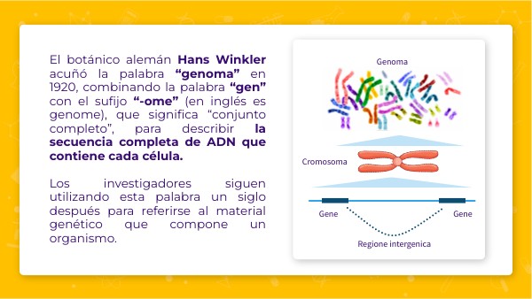 El botánico alemán Hans Winkler acuñó la palabra “genoma” en 1920, combinando la palabra “gen” con el sufijo “-ome” (en inglés es genome), que significa “conjunto completo”, para describir la secuencia completa de ADN que contiene cada célula. Los investigadores siguen utilizando esta palabra un siglo después para referirse al material genético que compone un organismo.