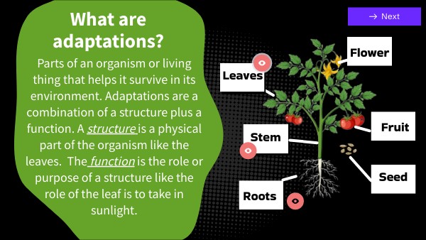 Parts of an organism or living thing that helps it survive in its environment. Adaptations are a combination of a structure plus a function. A structure is a physical part of the organism like the leaves. The function is the role or purpose of a structure like the role of the leaf is to take in sunlight.