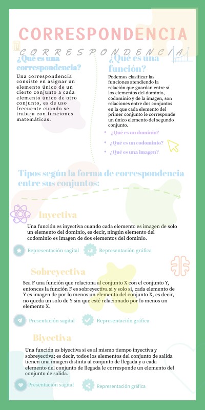 Una correspondencia consiste en asignar un elemento único de un cierto conjunto a cada elemento único de otro conjunto, es de uso frecuente cuando se trabaja con funciones matemáticas.
