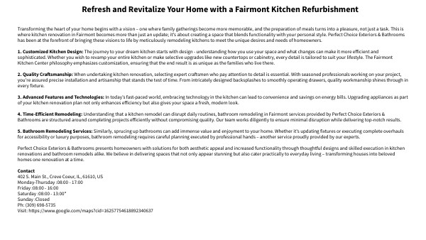 Transforming the heart of your home begins with a vision – one where family gatherings become more memorable, and the preparation of meals turns into a pleasure, not just a task. This is where kitchen renovation in Fairmont becomes more than just an update; it's about creating a space that blends functionality with your personal style. Perfect Choice Exteriors & Bathrooms has been at the forefront of bringing these visions to life by meticulously remodeling kitchens to meet the unique desires and needs of homeowners. 1. Customized Kitchen Design: The journey to your dream kitchen starts with design - understanding how you use your space and what changes can make it more efficient and sophisticated. Whether you wish to revamp your entire kitchen or make selective upgrades like new countertops or cabinetry, every detail is tailored to suit your lifestyle. The Fairmont Kitchen Center philosophy emphasizes customization, ensuring that the end result is as unique as the families who live there. 2. Quality Craftsmanship: When undertaking kitchen renovation, selecting expert craftsmen who pay attention to detail is essential. With seasoned professionals working on your project, you're assured precise installation and artisanship that stands the test of time. From intricately designed backsplashes to smoothly operating drawers, quality workmanship shines through in every fixture. 3. Advanced Features and Technologies: In today’s fast-paced world, embracing technology in the kitchen can lead to convenience and savings on energy bills. Upgrading appliances as part of your kitchen renovation plan not only enhances efficiency but also gives your space a fresh, modern look. 4. Time-Efficient Remodeling: Understanding that a kitchen remodel can disrupt daily routines, bathroom remodeling in Fairmont services provided by Perfect Choice Exteriors & Bathrooms are structured around completing projects efficiently without compromising quality. Our team works diligently to ensure minimal disruption while delivering top-notch results. 5. Bathroom Remodeling Services: Similarly, sprucing up bathrooms can add immense value and enjoyment to your home. Whether it's updating fixtures or executing complete overhauls for accessibility or luxury purposes, bathroom remodeling requires careful planning executed by professional hands – another service proudly provided by our experts. Perfect Choice Exteriors & Bathrooms presents homeowners with solutions for both aesthetic appeal and increased functionality through thoughtful designs and skilled execution in kitchen renovations and bathroom remodels alike. We believe in delivering spaces that not only appear stunning but also cater practically to everyday living – transforming houses into beloved homes one renovation at a time. Contact 402 S. Main St., Creve Coeur, IL, 61610, US Monday-Thursday :08:00 - 17:00 Friday :08:00 - 16:00 Saturday :08:00 - 13:00" Sunday :Closed Ph: (309) 698-5735 Email:lee@perfectchoicenow.com Visit: https://www.google.com/maps?cid=16257754618892340637