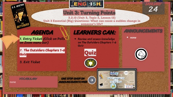 1. Entry Ticket (Click on Polls on Zoom menu bar) 2. The Outsiders Chapters 1-6 Quiz 3. Exit Ticket