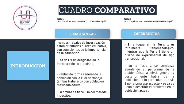 - Ambos trabajos de investigación están orientados al área educativa, son conscientes de la importancia de la educación. - Las dos tesis desglosan en la introducción su propósito, - Hablan de forma general de la población con la cuál se trabajó (ambas trabajaron con población mexicana adulta). - En ambas se hace uso del método inductivo,
