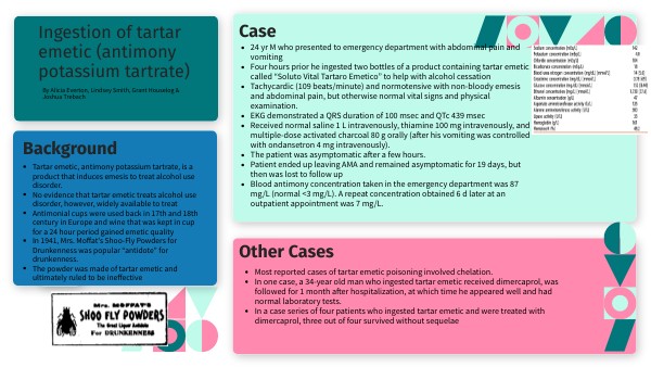 - In one case, a 34-year old man who ingested tartar emetic received dimercaprol, was followed for 1 month after hospitalization, at which time he appeared well and had normal laboratory tests.