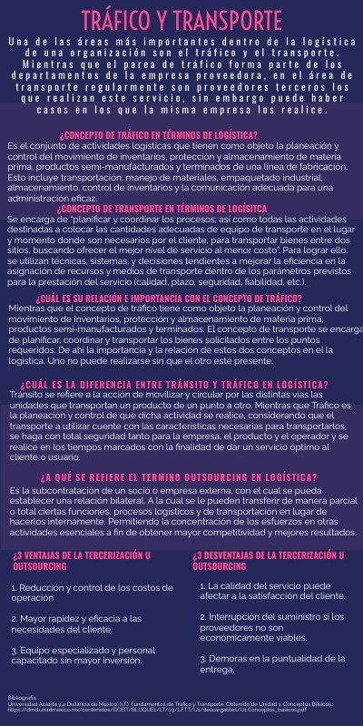 Mientras que el concepto de tráfico tiene como objeto la planeación y control del movimiento de inventarios, protección y almacenamiento de materia prima, productos semi-manufacturados y terminados. El concepto de transporte se encarga de planificar, coordinar y transportar los bienes solicitados entre los puntos requeridos. De ahí la importancia y la relación de estos dos conceptos en el la logística. Uno no puede realizarse sin que el otro esté presente.