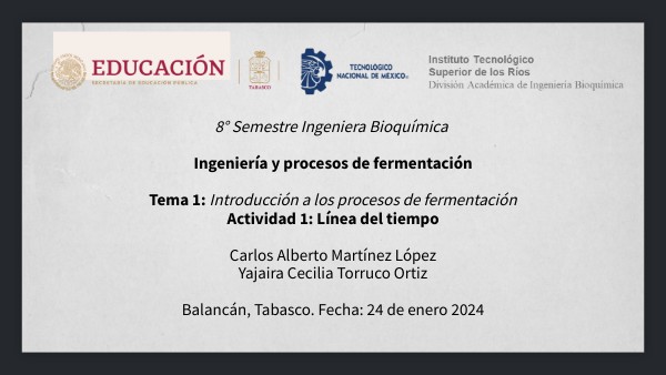 8° Semestre Ingeniera Bioquímica Ingeniería y procesos de fermentación Tema 1: Introducción a los procesos de fermentación Actividad 1: Línea del tiempo Carlos Alberto Martínez López Yajaira Cecilia Torruco Ortiz Balancán, Tabasco. Fecha: 24 de enero 2024