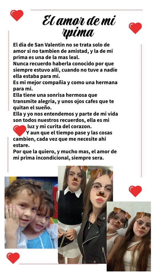 El dia de San Valentin no se trata solo de amor si no tambien de amistad, y la de mi prima es una de la mas leal. Nunca recuerdo haberla conocido por que siempre estuvo alli, cuando no tuve a nadie ella estaba para mi. Es mi mejor compañia y como una hermana para mi. Ella tiene una sonrisa hermosa que transmite alegria, y unos ojos cafes que te quitan el sueño. Ella y yo nos entendemos y parte de mi vida son todos nuestros recuerdos, ella es mi luz y mi curita del corazon. Y aun que el tiempo pase y las cosas cambien, cada vez que me necesite ahi estare. Por que la quiero, y mucho mas, el amor de mi prima incondicional, siempre sera.