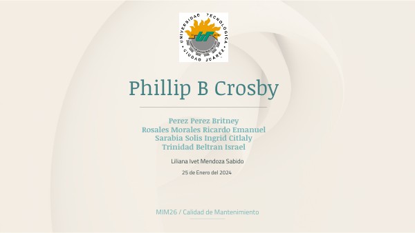 Philip Bayard Crosby nos da una de idea sobre una vision de la calidad donde se descata la prevencion ante todo, ya que en palabras del mismo es mas costoso solucionar problemas que prevenirlos, sumandose a esto, nos da pasos para poder lograr la excelencia. De igual manera podemos entender como el concepto e ideas sobre la calidad, que a traves del tiempo estas se cambia y mejora, creando procedimientos con el fin de aumentar la eficacia y lograr estandares altos, igual partiendo de las etapas de calidad nos ayuda a mantener un orden y disminuir los errores e igual a identificar los defectos en el proceso y con ayuda de serie de procedimientos poder encontrar una menerade solucionarlos. philip otorga no solo conocimiento a las nuevas generaciones si no abre un campo grande a seguir, usando sus principios sobre calidad ayuda a enter de una mejor manera como alcanzar en sus propias palabras la excelencia.