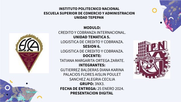 MODULO: CREDITO Y COBRANZA INTERNACIONAL. UNIDAD TEMATICA 5. LOGISTICA DE CREDITO Y COBRANZA. SESION 6. LOGISTICA DE CREDITO Y COBRANZA. DOCENTE: TATIANA MARGARITA ORTEGA ZARATE. INTEGRANTES: GUTIERREZ BALDERAS DIANA KARINA PALACIOS FLORES AISLIN POULET SANCHEZ ALEGRIA CECILIA GRUPO: 3NX3. FECHA DE ENTREGA: 25 ENERO 2024. PRESENTACION DIGITAL
