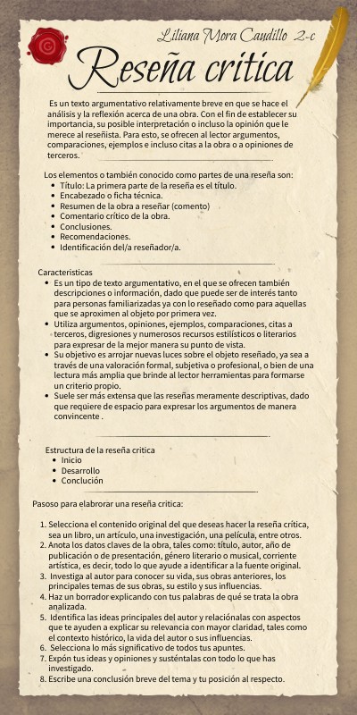 Es un texto argumentativo relativamente breve en que se hace el análisis y la reflexión acerca de una obra. Con el fin de establecer su importancia, su posible interpretación o incluso la opinión que le merece al reseñista. Para esto, se ofrecen al lector argumentos, comparaciones, ejemplos e incluso citas a la obra o a opiniones de terceros.