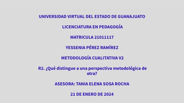 UNIVERSIDAD VIRTUAL DEL ESTADO DE GUANAJUATO LICENCIATURA EN PEDAGOGÍA MATRICULA 21011117 YESSENIA PÉREZ RAMÍREZ METODOLOGÍA CUALITATIVA V2 R2. ¿Qué distingue a una perspectiva metodológica de otra? ASESORA: TANIA ELENA SOSA ROCHA 21 DE ENERO DE 2024