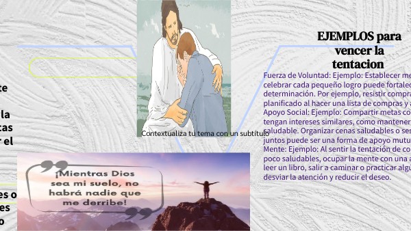 Fuerza de Voluntad: Icono que represente la fuerza de voluntad. Descripción: La fuerza de voluntad es clave para resistir la tentación. Fortalecerla mediante prácticas como establecer metas claras, visualizar el éxito y recompensarse por los logros. Apoyo Social: Icono de personas conectadas o un grupo. Descripción: Contar con el apoyo de amigos, familiares o grupos que comparten objetivos similares puede proporcionar un sistema de apoyo esencial para superar las tentaciones. Distraer la Mente: Icono de una mente distraída o ocupada. Descripción: Mantener la mente ocupada con actividades positivas y productivas puede reducir la posibilidad de caer en la tentación.