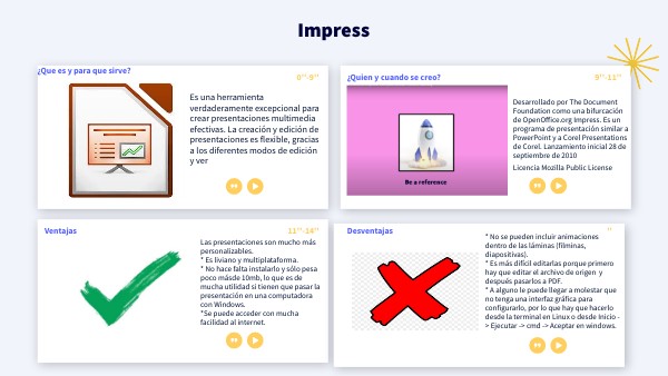 Desarrollado por The Document Foundation como una bifurcación de OpenOffice.org Impress. Es un programa de presentación similar a PowerPoint y a Corel Presentations de Corel. Lanzamiento inicial 28 de septiembre de 2010 Licencia Mozilla Public License