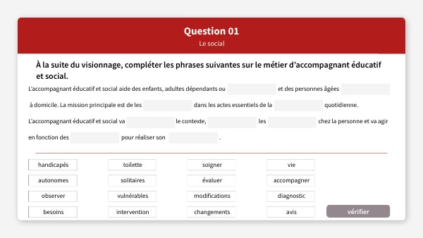 À la suite du visionnage, compléter les phrases suivantes sur le métier d’accompagnant éducatif et social.