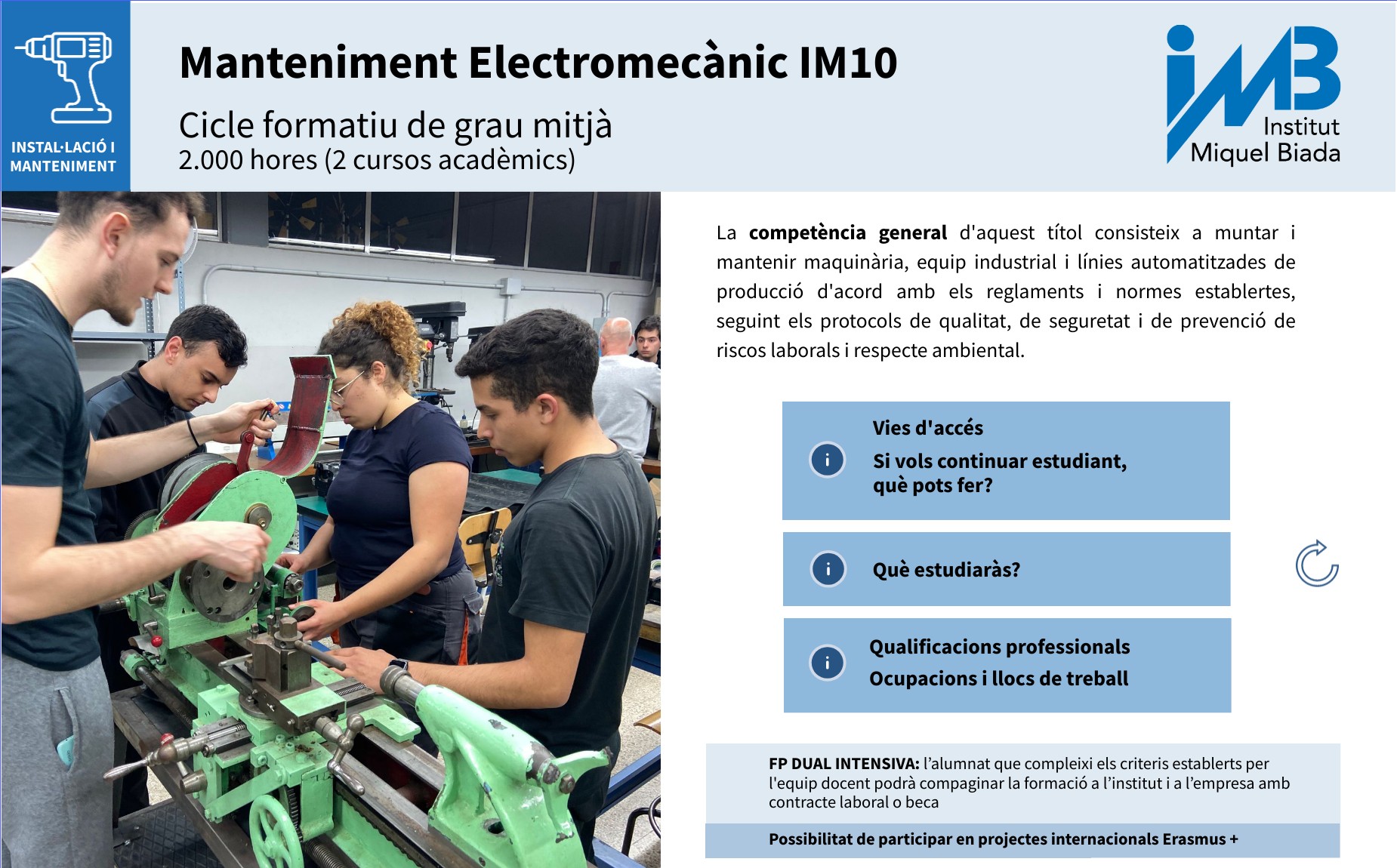 FP DUAL INTENSIVA: l’alumnat que compleixi els criteris establerts per l'equip docent podrà compaginar la formació a l’institut i a l’empresa amb contracte laboral o beca
