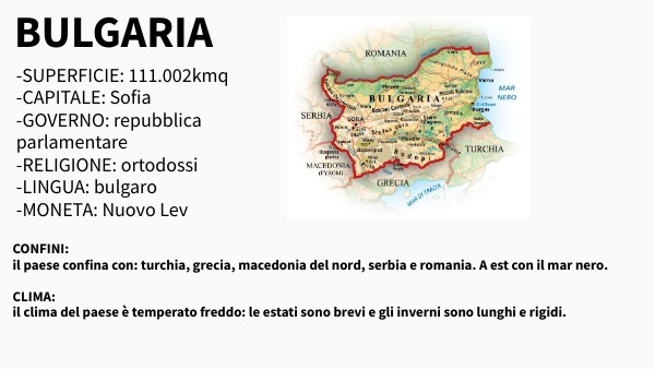 CONFINI:il paese confina con: turchia, grecia, macedonia del nord, serbia e romania. A est con il mar nero. CLIMA: il clima del paese è temperato freddo: le estati sono brevi e gli inverni sono lunghi e rigidi.