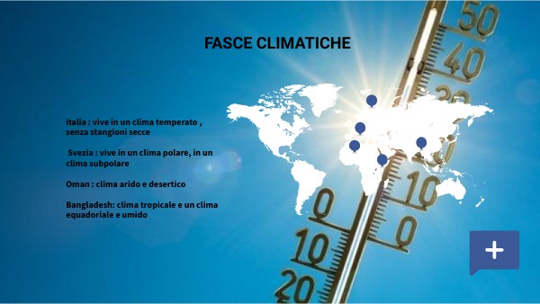 italia : vive in un clima temperato , senza stangioni secce Svezia : vive in un clima polare, in un clima subpolare Oman : clima arido e desertico Bangladesh: clima tropicale e un clima equadoriale e umido