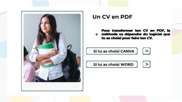 Pour transformer ton CV en PDF, la méthode va dépendre du logiciel que tu as choisi pour faire ton CV.