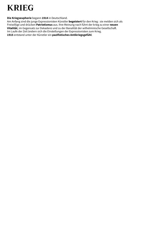 Die Kriegseuphorie begann 1914 in Deutschland. Am Anfang sind die junge Expressionisten Kùnstler begeistert fùr den Krieg : sie melden sich als Freiwillige und drùcken Patriotismus aus. Ihre Meinung nach fùhrt der krieg zu einer neuen Vitalitàt, im Gegensatz zur Dekadenz und zu der Banalitàt der wilhelminische Gesellschaft. Im Laufe der Zeit àndern sich die Einstellungen der Expressionisten zum Krieg. 1915 entstand unter der Kùnstler ein pazifistisches Antikriegsgefùhl.