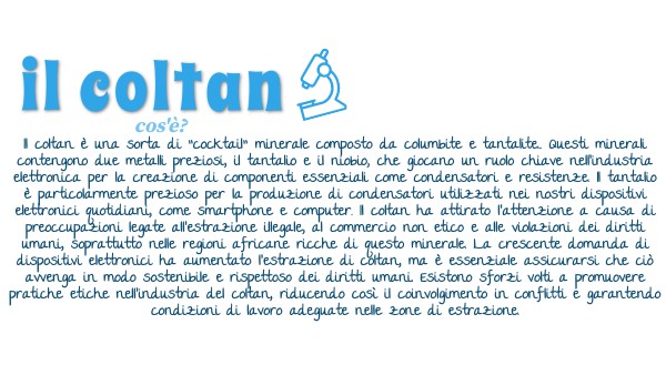 Il coltan è una sorta di "cocktail" minerale composto da columbite e tantalite... Questi minerali contengono due metalli preziosi, il tantalio e il niobio, che giocano un ruolo chiave nell'industria elettronica per la creazione di componenti essenziali come condensatori e resistenze. Il tantalio è particolarmente prezioso per la produzione di condensatori utilizzati nei nostri dispositivi elettronici quotidiani, come smartphone e computer. Il coltan ha attirato l'attenzione a causa di preoccupazioni legate all'estrazione illegale, al commercio non etico e alle violazioni dei diritti umani, soprattutto nelle regioni africane ricche di questo minerale. La crescente domanda di dispositivi elettronici ha aumentato l'estrazione di coltan, ma è essenziale assicurarsi che ciò avvenga in modo sostenibile e rispettoso dei diritti umani. Esistono sforzi volti a promuovere pratiche etiche nell'industria del coltan, riducendo così il coinvolgimento in conflitti e garantendo condizioni di lavoro adeguate nelle zone di estrazione.