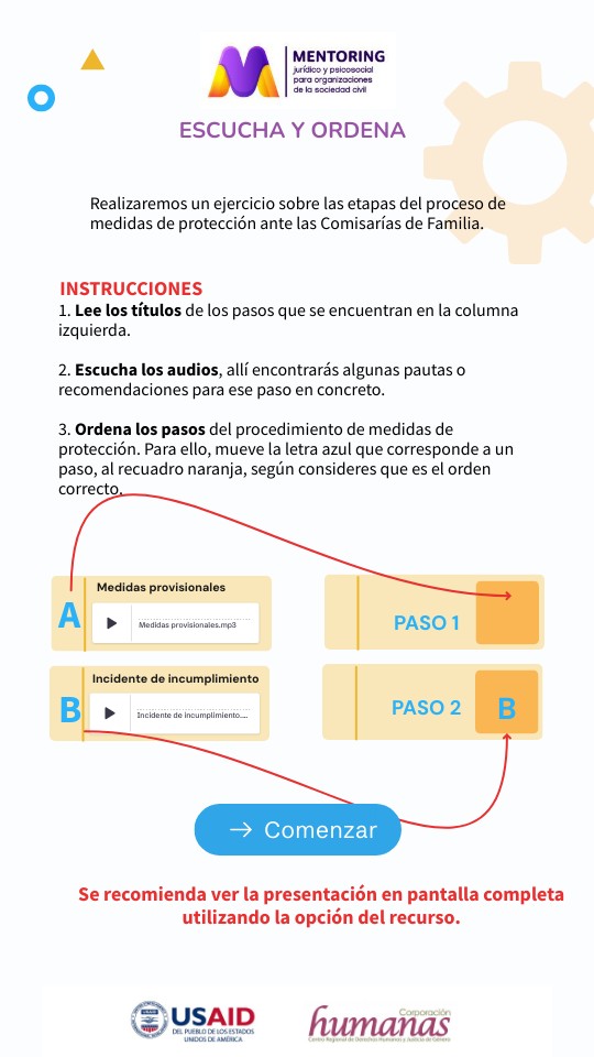 1. Lee los títulos de los pasos que se encuentran en la columna izquierda. 2. Escucha los audios, allí encontrarás algunas pautas o recomendaciones para ese paso en concreto. 3. Ordena los pasos del procedimiento de medidas de protección. Para ello, mueve la letra azul que corresponde a un paso, al recuadro naranja, según consideres que es el orden correcto.