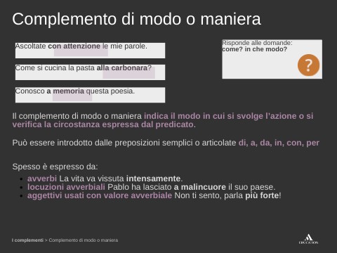 Il complemento di modo o maniera indica il modo in cui si svolge l’azione o si verifica la circostanza espressa dal predicato.