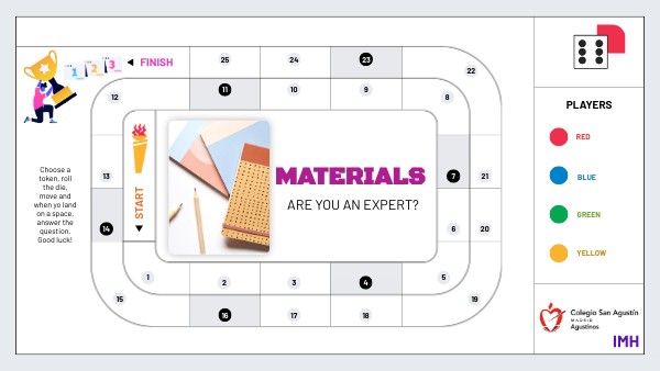 Choose a token, roll the die, move and when yo land on a space, answer the question. Good luck!