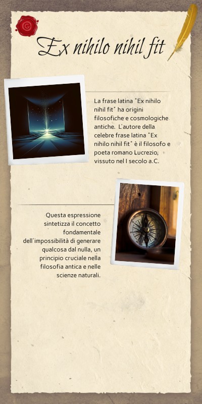 La frase latina "Ex nihilo nihil fit" ha origini filosofiche e cosmologiche antiche. L'autore della celebre frase latina "Ex nihilo nihil fit" è il filosofo e poeta romano Lucrezio, vissuto nel I secolo a.C.