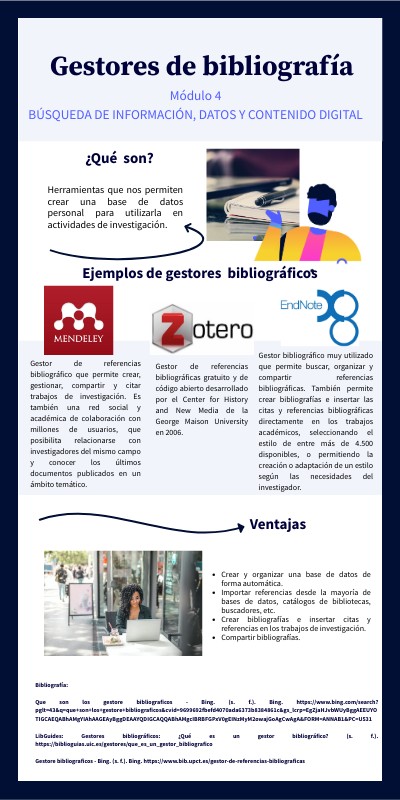 Bibliografía:Que son los gestore bibliograficos - Bing. (s. f.). Bing. https://www.bing.com/search?pglt=43&q=que+son+los+gestore+bibliograficos&cvid=9699692fbefd4070ada6373b8384861c&gs_lcrp=EgZjaHJvbWUyBggAEEUYOTIGCAEQABhAMgYIAhAAGEAyBggDEAAYQDIGCAQQABhAMgcIBRBFGPxV0gEINzMyM2owajGoAgCwAgA&FORM=ANNAB1&PC=U531 LibGuides: Gestores bibliográficos: ¿Qué es un gestor bibliográfico? (s. f.). https://biblioguias.uic.es/gestores/que_es_un_gestor_bibliografico Gestore bibliograficos - Bing. (s. f.). Bing. https://www.bib.upct.es/gestor-de-referencias-bibliograficas