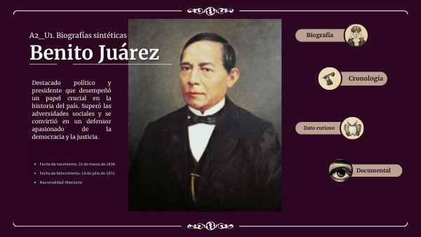 Benito Juárez, nacido el 21 de marzo de 1806 en San Pablo Guelatao, Oaxaca, México, desempeñó un papel crucial en la historia de México. De ascendencia indígena zapoteca, superó desafíos y se convirtió en un destacado político. Presidente de México en varias ocasiones, implementó la Ley de Reforma, separando Iglesia y Estado, y promovió la educación laica. Su legado incluye la consolidación de la República laica y la defensa de los derechos civiles, siendo un símbolo de resistencia ante la intervención extranjera y la opresión.