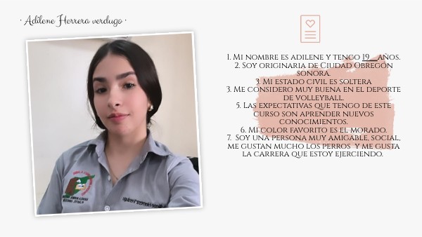 1. Mi nombre es adilene y tengo 19__años. 2. Soy originaria de Ciudad Obregón sonora. 3. Mi estado civil es soltera 3. Me considero muy buena en el deporte de volleyball. 5. Las expectativas que tengo de este curso son aprender nuevos conocimientos. 6. Mi color favorito es el morado. 7. Soy una persona muy amigable, social, me gustan mucho los perros y me gusta la carrera que estoy ejerciendo.