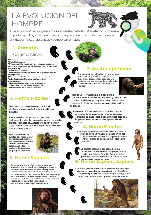 Todas estas especies fueron evolucionando, teniendo cada vez cualidades más parecidas a las nuestras, y tras millones de años consiguieron evolucionar hasta convertirse en nuestra especie, los Homo sapiens. Los Homo sapiens fueron capaces de extenderse por todos los continentes, siendo mucho más habilidosos que las anteriores especies y creando herramientas que incluso los neandertales eran incapaces de fabricar