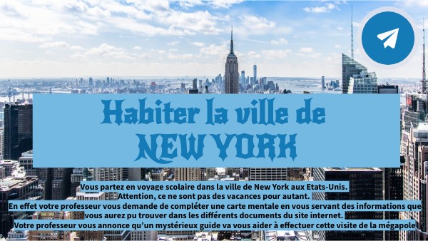 Vous partez en voyage scolaire dans la ville de New York aux Etats-Unis. Attention, ce ne sont pas des vacances pour autant. En effet votre professeur vous demande de compléter une carte mentale en vous servant des informations que vous aurez pu trouver dans les différents documents du site internet. Votre professeur vous annonce qu’un mystérieux guide va vous aider à effectuer cette visite de la mégapole
