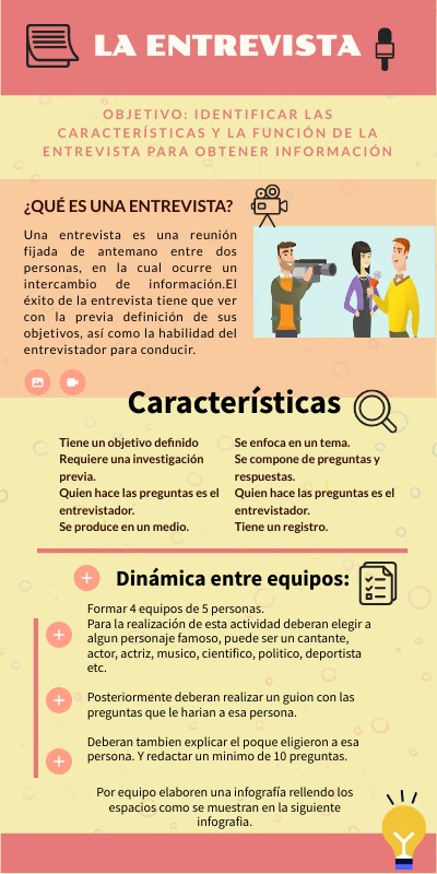 Formar 4 equipos de 5 personas.Para la realización de esta actividad deberan elegir a algun personaje famoso, puede ser un cantante, actor, actriz, musico, cientifico, politico, deportista etc. Posteriormente deberan realizar un guion con las preguntas que le harian a esa persona. Deberan tambien explicar el poque eligieron a esa persona. Y redactar un minimo de 10 preguntas.
