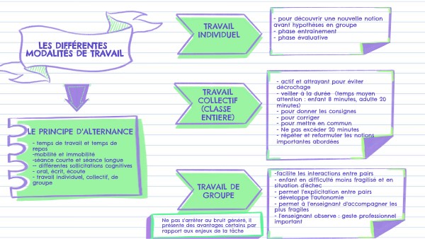 - temps de travail et temps de repos -mobilité et immobilité -séance courte et séance longue -- différentes sollicitations cognitives - oral, écrit, écoute - travail individuel, collectif, de groupe