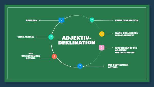 Welche Adjektivendung ist richtig? Die Adjektivendung hängt von folgenden Punkten ab: - Ist das Substantiv maskulin, feminin oder neutral? - Steht das Substantiv im Singular oder im Plural? - Haben wir einen Nominativ, Dativ, Akkusativ oder Genitiv? - Welcher Artikel steht vor dem Substantiv: der bestimmte Artikel, der unbestimmte Artikel oder gar kein Artikel? Deshalb gibt es auch 3 verschiedene Deklinationen.