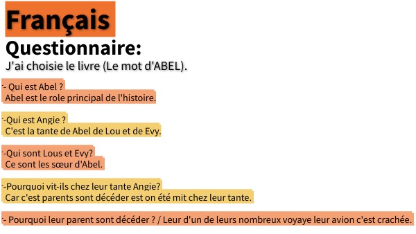 -Abel a peur de quoi avec des gens comme lui qui cherche encore leur mot ? Il on peur un mot noir cette a dire (meurtre , crime etc ). -Que c'est t-il passer a son école ? Une personne a divulger le mot d'une fille sans son concentement. -été t-il retounée quand il on vu que le mot de cette fille a été divulguer ? Oui il été retournée il s'en son meme revenu a pied au lieux du bus. -Lou,Evy et Abel en on t-il parlée a leur tante Angie de cette incident ? Oui ils lui en on parlée car ils été encore choqué. -Que leur a dit leur tante Angie ? Elle leur a dit que c'etait vraiment pas bien de faire ce est que ce qui fond ca peuvent aller en prison.