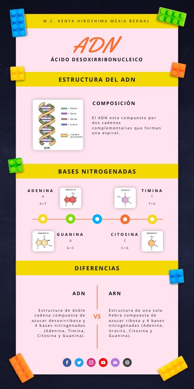 Estructura de doble cadena compuesta de azucar desoxirribosa y 4 bases nitrogenadas (Adenina, Timina, Citosina y Guanina).
