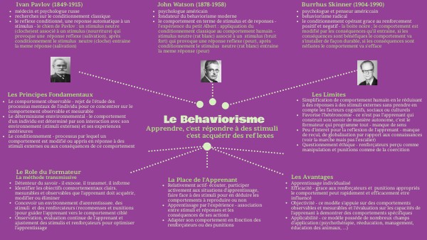 - le comportement en terme de stimulus et de reponses - l'expérience du petit Albert : appliquation du conditionnement classique au comportement humain - stimulus neutre (rat blanc) associé à un stimulus (bruit fort) qui provoque une réponse reflexe (peur), après conditionnement le stimulus neutre (rat blanc) entraine la meme réponse (peur)