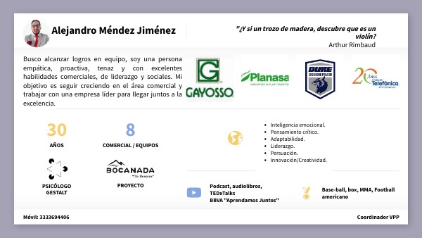 Busco alcanzar logros en equipo, soy una persona empática, proactiva, tenaz y con excelentes habilidades comerciales, de liderazgo y sociales. Mi objetivo es seguir creciendo en el área comercial y trabajar con una empresa líder para llegar juntos a la excelencia.