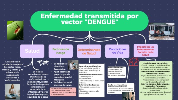Determinantes Biológicos:- Susceptibilidad genética.- Respuesta inmunológica individual.Determinantes Ambientales:- Clima tropical y estacionalidad. - Urbanización y cambios en el entorno.Determinantes Sociales:- Niveles socioeconómicos bajos.- Educación y acceso a la información.