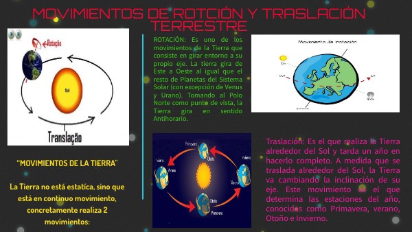 Traslación: Es el que realiza la Tierra alrededor del Sol y tarda un año en hacerlo completo. A medida que se traslada alrededor del Sol, la Tierra va cambiando la inclinación de su eje. Este movimiento es el que determina las estaciones del año, conocidas como Primavera, verano, Otoño e Invierno.