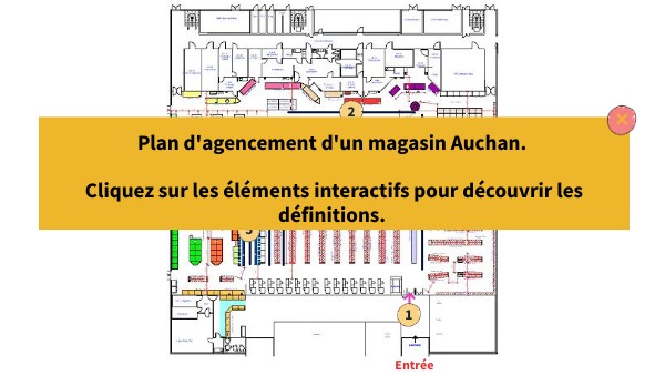 Plan d'agencement d'un magasin Auchan. Cliquez sur les éléments interactifs pour découvrir les définitions.