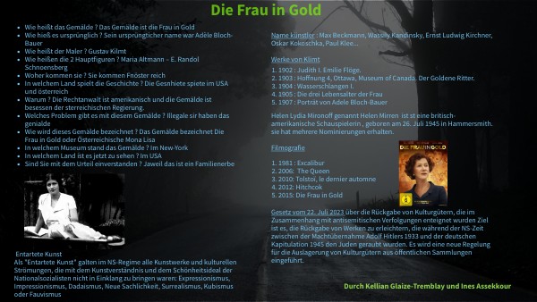 Name künstler : Max Beckmann, Wassily Kandinsky, Ernst Ludwig Kirchner, Oskar Kokoschka, Paul Klee... Werke von Klimt Helen Lydia Mironoff genannt Helen Mirren ist st eine britisch-amerikanische Schauspielerin , geboren am 26. Juli 1945 in Hammersmith. sie hat mehrere Nominierungen erhalten. Filmografie Gesetz vom 22. Juli 2023 über die Rückgabe von Kulturgütern, die im Zusammenhang mit antisemitischen Verfolgungen enteignet wurden Ziel ist es, die Rückgabe von Werken zu erleichtern, die während der NS-Zeit zwischen der Machtübernahme Adolf Hitlers 1933 und der deutschen Kapitulation 1945 den Juden geraubt wurden. Es wird eine neue Regelung für die Auslagerung von Kulturgütern aus öffentlichen Sammlungen eingeführt.