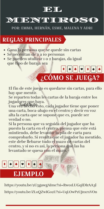 El fin de este juego es quedarse sin cartas, para ello hay que mentir. Se reparten todas les cartas de la baraja entre los jugadores que haya. Una vez hecho esto, cada jugador tiene que poner una carta, boca-abajo en el centro y decir en voz alta la carta que se supone que es, puede ser verdad o no. Si la persona que va seguida del jugador que ha puesto la carta en el centro, piensa que este está mintiendo, debe levantar la pila de carta para comprobarlo. Si resulta que el jugador ha mentido, este debe llebarse tudo el mazo de cartas del centro, y si no es asi, la persona que las ha levantado se quesa con el mazo.