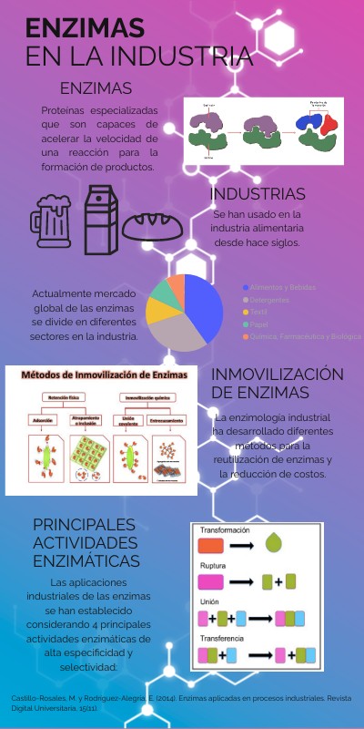 Castillo-Rosales, M. y Rodríguez-Alegría, E. (2014). Enzimas aplicadas en procesos industriales. Revista Digital Universitaria, 15(11).
