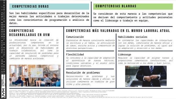 International Labour Organization. (2021). Competencias y aprendizaje permanente: cuatro cuestiones clave en la CIT. [archivo de video]. Recuperado de https://youtu.be/YVigQuaBqDU Reyes, I. (2023, 7 de abril). La importancia de las habilidades blandas para el desarrollo profesional. CognosOnline. https://cognosonline.com/mx/blog-mx/habilidades-blandas/#:~:text=Las%20habilidades%20blandas%2C%20tambi%C3%A9n%20conocidas,y%20adaptarse%20a%20situaciones%20cambiantes. TEDx talks. (30 de julio 2021). Desarrolla tus competencias para la nueva era de la globalización Alberto García |TEDxUNLA. https://www.youtube.com/watch?v=kAun5Qmr0Hw TEDx talks. (13 enero 2020). Industria 4.0 "Cambiando esquemas y creando nuevas oportunidades" | Nasser Mohamed | TEDxUANL. [Video] https://youtu.be/K2cOViIZWD8 Victoria Masterson. (23 agosto 2021). Estas son las habilidades que los jóvenes necesitarán para los empleos verdes del futuro. https://www.weforum.org/agenda/2021/08/these-are-the-skills-young-people-will-need-for-the-green-jobs-of-the-future/