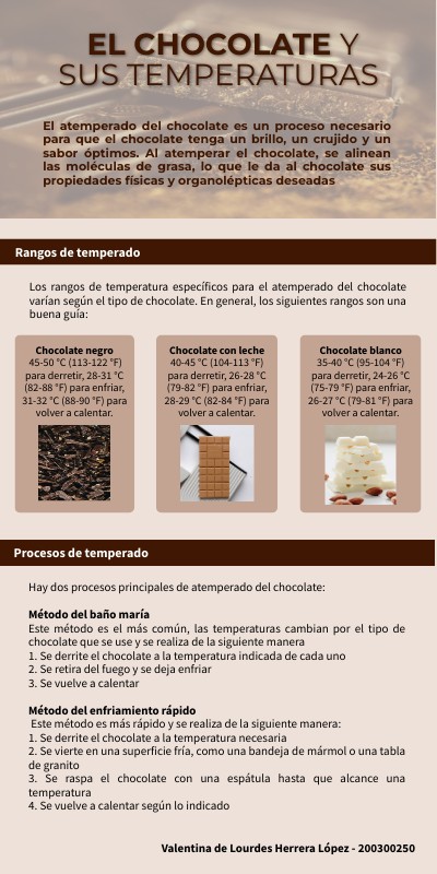 Los rangos de temperatura específicos para el atemperado del chocolate varían según el tipo de chocolate. En general, los siguientes rangos son una buena guía: