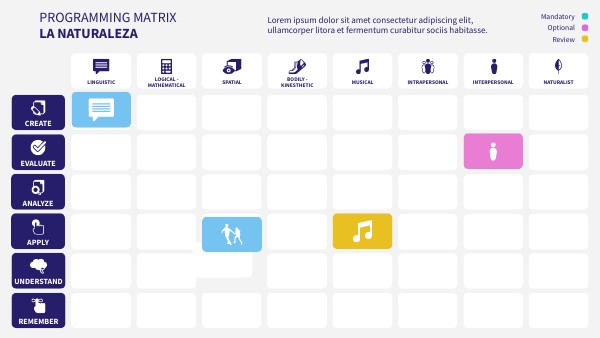 1- ¿Qué inteligencia y categoría Bloom trabaja? Musical + analizar. 2- Objetivo de aprendizaje: Motivar a los niños a ser creativos y componer una canción con elementos de la naturaleza. 3- Desafío: ¿Qué debe resolverse? Los niños deben usar sus habilidades y conocimientos sobre la música para componer una canción. 4- Resultado o producto final a obtener: La canción creada a la naturaleza. 5- Materiales y documentos: -Animales y plantas -Instrumentos musicales. - Papel y lápiz. 6- Tiempo de ejecución: Esta actividad tomará aproximadamente 2 días de clase.