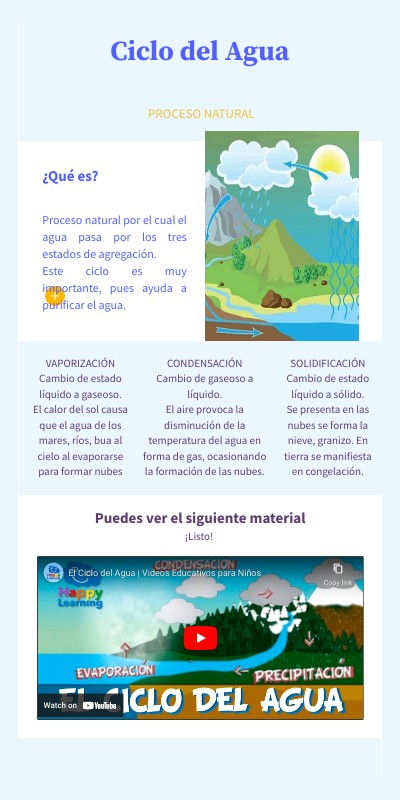 Proceso natural por el cual el agua pasa por los tres estados de agregación.Este ciclo es muy importante, pues ayuda a purificar el agua.
